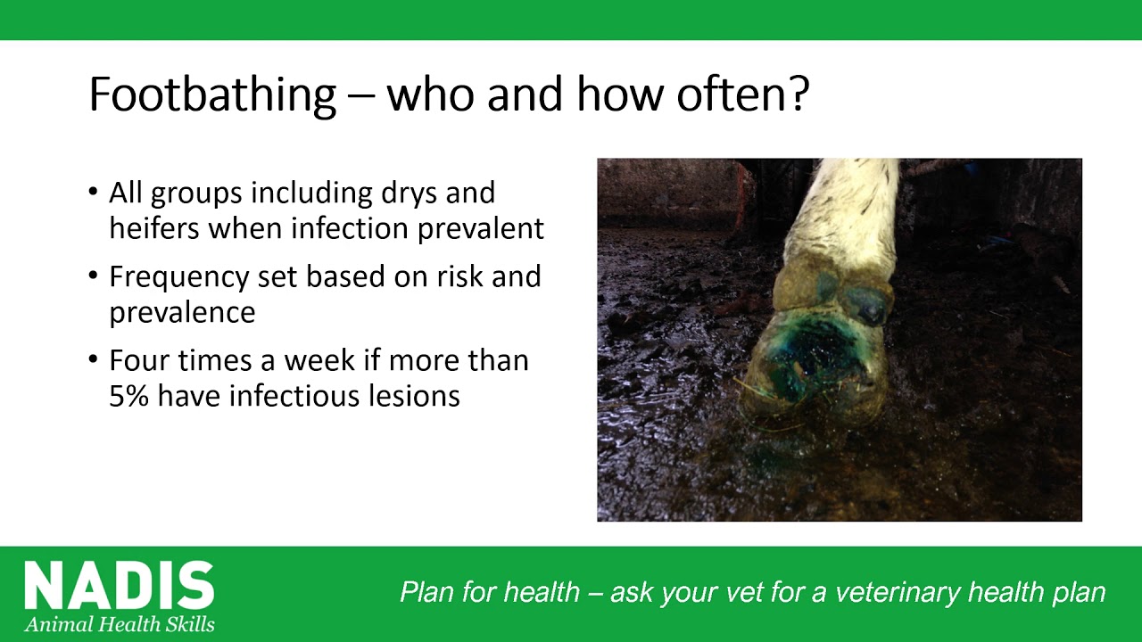 Taking steps to improve foot hygiene and introducing foot disinfection (foot bathing) can be an extremely effective and rapid way of improving foot health. However, if foot bathing is performed incorrectly it can contribute to the rapid spread of infections and contaminated baths could pose a mastitis risk. Furthermore, some chemicals can burn the skin or cause severe pain on open sores.