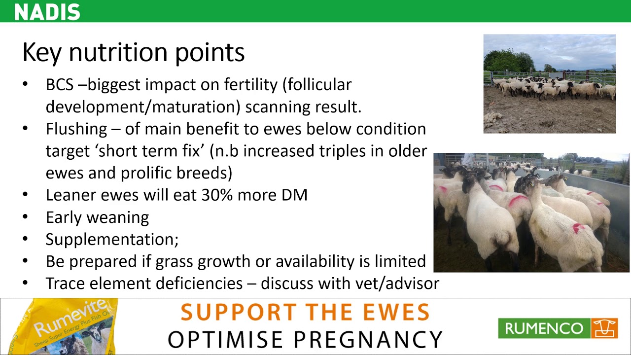 Ewes in body condition score 2.5 - 3.0 generally respond well to a rising plane of nutrition for at least three weeks before and during the mating period.