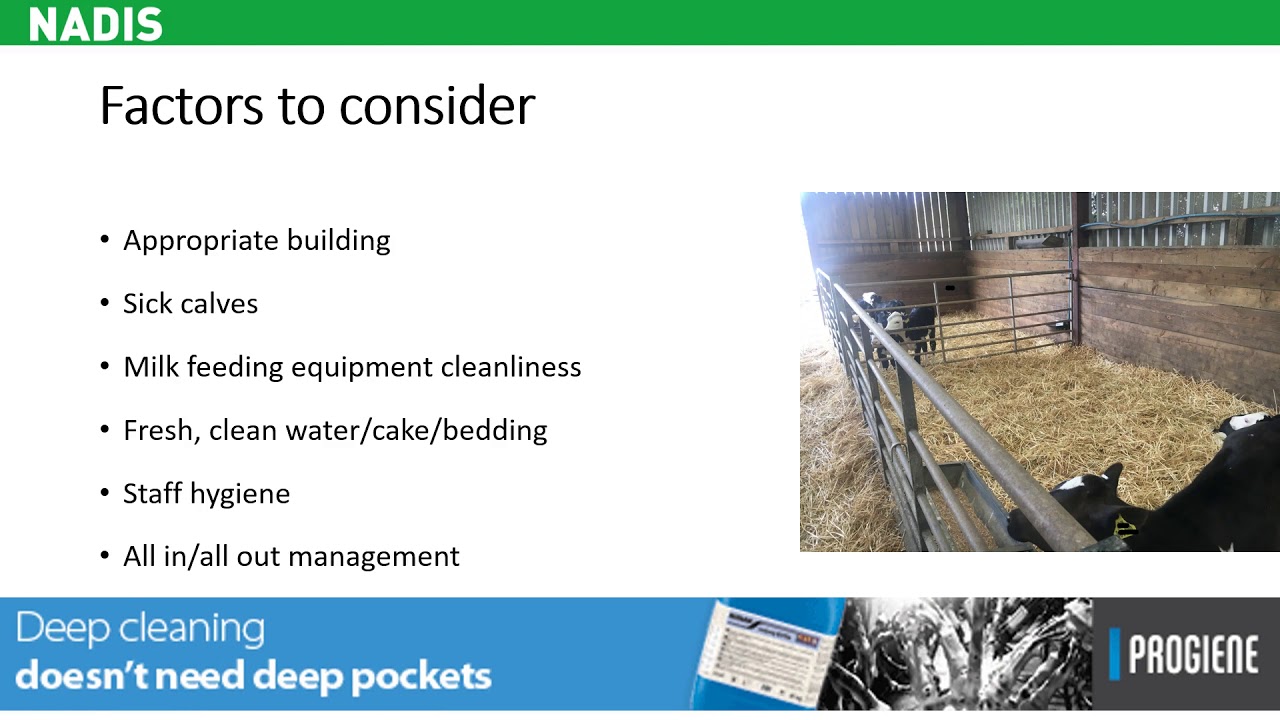 Almost all infection occurs by direct aerosol spread between calves, so it is vital that there is good ventilation to allow for removal of infectious organisms. Similarly an increase in humidity will favour viral/bacterial survival.