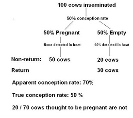 However, non-return has a major disadvantage in that wrongly classifies a large number of cattle as being pregnant when they are not. As the calculation in Table 1 shows, using non-return almost 30% of cows assumed to be in-calf 21 days after service will actually be empty. If the conception rate is lower than 50%, which is the case on many farms, the inaccuracy is even greater. Allowing a longer period improves the accuracy because additional heats can be observed, but even after 42 days, it is likely that around 20% of cattle thought to be pregnant are actually not.