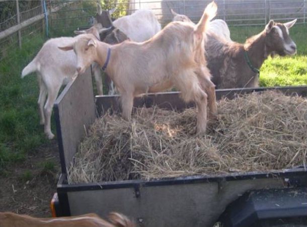 As ruminants, more than 60% of their daily ration should be made up forage, this may be hay, straw, pea straw or silage depending on how they are kept, bearing in mind that some forages are better quality nutritionally than others and may need additional supplementation. Large commercial units may feed a TMR (total mixed ration) based on maize and grass silage with protein and energy balancers. The forage needs to be balanced nutritionally with either a commercial compound such as pellets or a course mix, or cereal grain such as oats, wheat or barley can be fed (although great care must be taken to introduce cereal grains gradually and not to overfeed). If you are feeding a group of goats a course mix, it is important to ensure that they can all feed together, otherwise the dominant goats that feed first will select the best bits - leaving poorer quality feed for the shy feeders - feeding pellets overcomes this selectivity. The basic recommendation is that a goat should receive no more than 1.0% total body weight of compound / day for maintenance, a gradual increase will be required for late pregnancy and heavy lactation demands. Care with tit-bits - do not let your goat get too fat!!