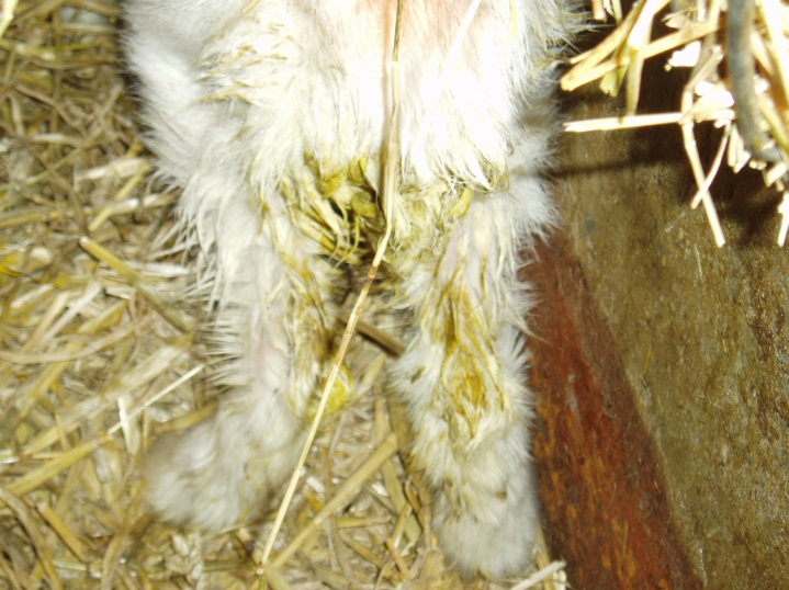 Infection is most commonly seen in young growing kids, particularly if intensively reared. The parasite has a massive multiplication potential, it is estimated for example that for every single oocyst that is ingested, up to 1 million can be excreted. Clinical signs can vary from sudden onset with blood and mucous stained diarrhoea, straining to pass faeces and abdominal pain in acute cases, to weight loss and pasty diarrhoea in more chronic cases (Fig 8).