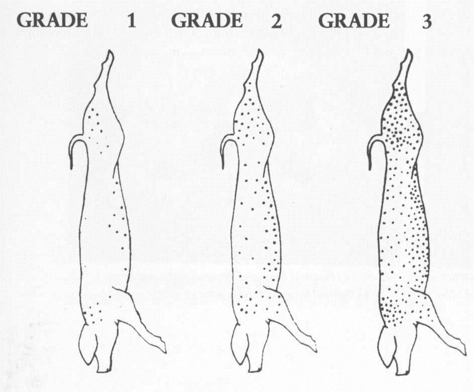 The allergic form of mange is seen in older pigs and adults and probably represents re-infestation of a sensitive individual. Huge numbers of small round red pimples occur over the whole body and take several weeks to disappear following treatment. This form of the disease forms the basis for the 1-3 scoring system for papular dermatitis used as part of the disease monitoring process within the British Pig Health Scheme. (BPHS)(Fig 4). Because of the irritation, damage from aggression may be a feature of mange and may include tail and ear biting, vulval biting and savaging of piglets. In addition, growth rates will decline by up to 15% and feed usage in heavily infested sows will be increased by 10% or more.